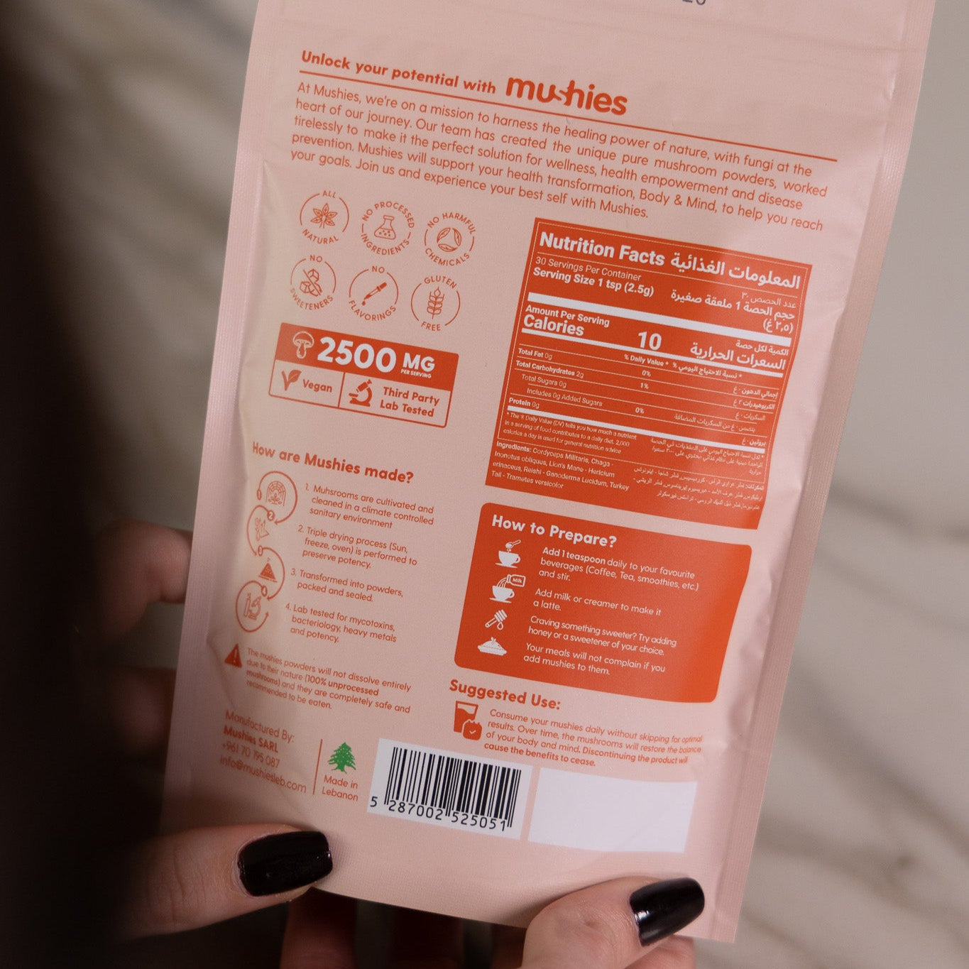 Mushies uses 100% natural, high-quality mushroom extracts, free from fillers, artificial additives, or nonsense. Just pure, science-backed benefits in every serving.